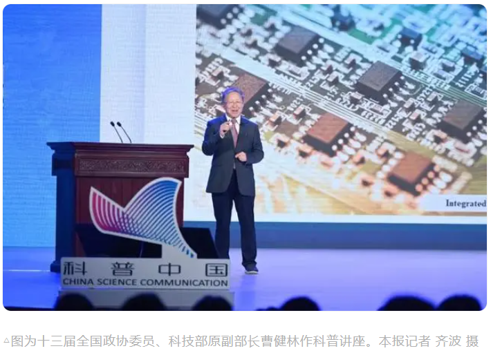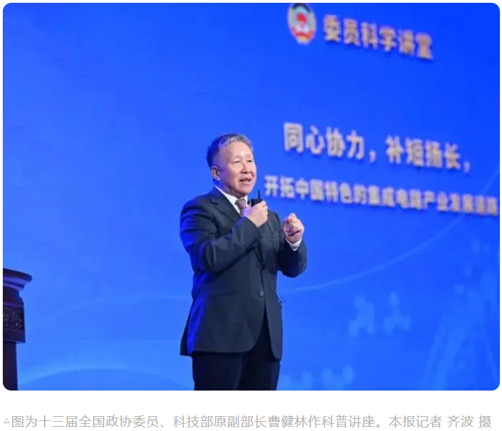 “芯片問題是事關(guān)百年發(fā)展的長期戰(zhàn)略問題,不是短期應(yīng)急問題,必須持之以恒去發(fā)展。”“要充分發(fā)揮制度優(yōu)勢,集中優(yōu)勢隊伍持續(xù)攻關(guān)。”“要敢于開辟新賽道,打造新生態(tài),推進(jìn)‘再全球化’。”……9月25日下午,寬敞明亮的全國政協(xié)禮堂里,十三屆全國政協(xié)委員、教科衛(wèi)體委員會副主任曹健林正站在舞臺中央巨大的顯示屏前,以“同心協(xié)力,補短揚長,開拓中國特色的集成電路產(chǎn)業(yè)發(fā)展道路”為題,為坐在臺下的全國政協(xié)委員、地方政協(xié)委員、高校學(xué)生、科研工作者等700余名觀眾作科普講座。