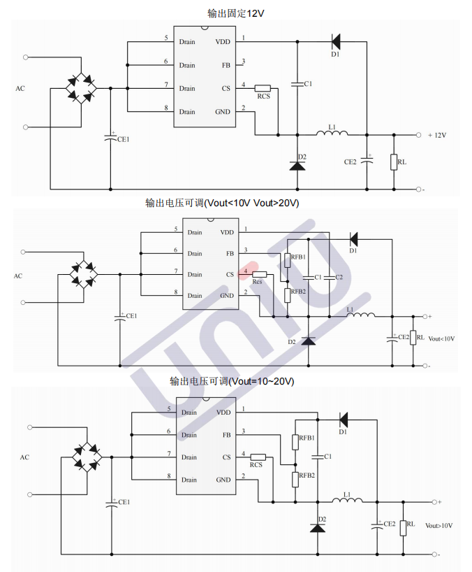 •主要特點(diǎn):集成 650V 高壓?jiǎn)?dòng)電路;多模式控制、無(wú)異音工作;支持降壓和升降壓拓?fù)?默認(rèn) 12V 輸出( FB 腳懸空);待機(jī)功耗低于 50mW;良好的線性調(diào)整率和負(fù)載調(diào)整率;集成軟啟動(dòng)電路;內(nèi)部保護(hù)功能 :過(guò)載保護(hù) (OLP);逐周期電流限制 (OCP);輸出過(guò)壓保護(hù) (OVP);VDD 過(guò)壓、欠壓和電壓箝位保護(hù)