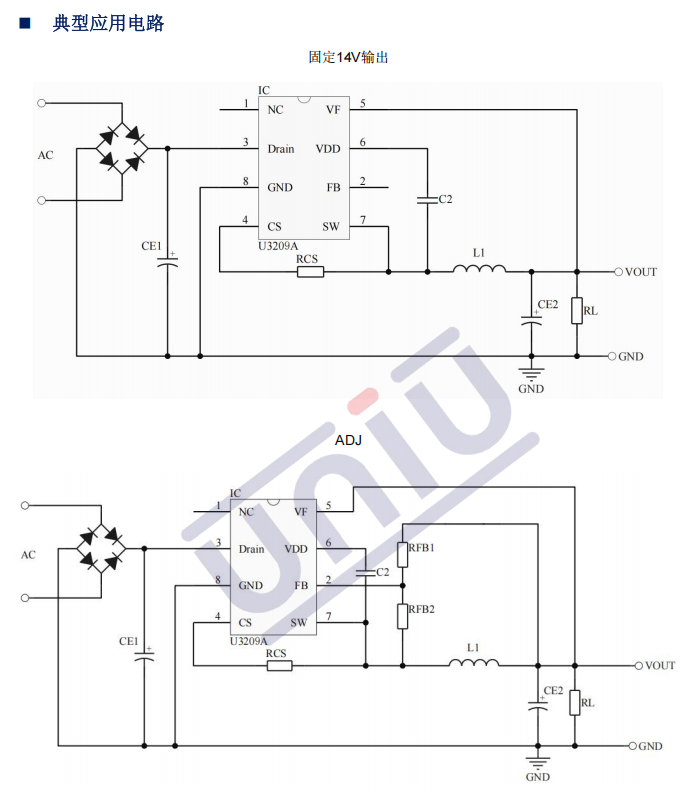 集成12Ω,500V MOS; 集成 500V 高壓?jiǎn)?dòng)電路 ; 集成續(xù)流二極管;多模式控制、無異音工作 ;支持降壓和升降壓拓?fù)?/span>; 默認(rèn) 14V 輸出( FB 腳懸空);待機(jī)功耗低于 50mW;良好的線性調(diào)整率和負(fù)載調(diào)整率;集成軟啟動(dòng)電路 ;內(nèi)部保護(hù)功能 : 過載保護(hù) (OLP) ;逐周期電流限制 (OCP) ; 輸出過壓保護(hù) (OVP); VDD 過壓、欠壓和電壓箝位保護(hù)