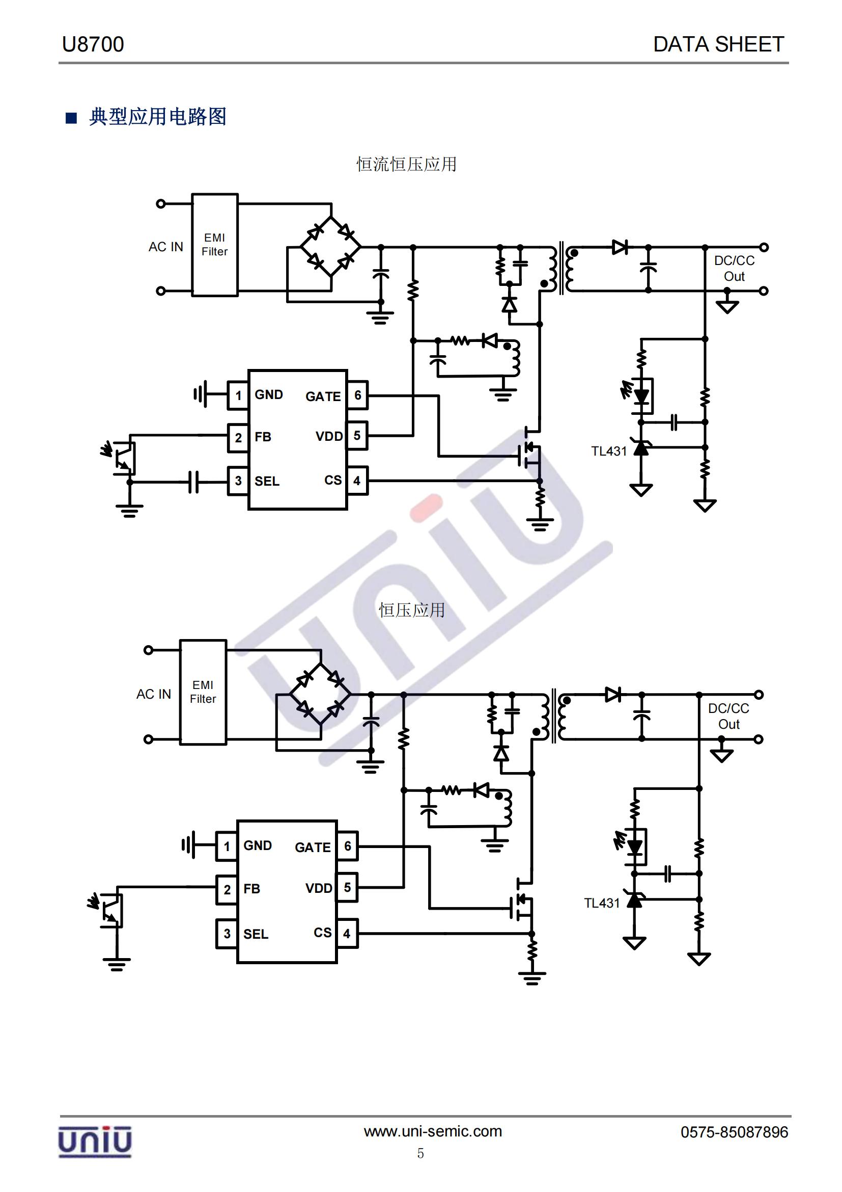 U8700是一款針對離線式反激電源設(shè)計的高性能功率開關(guān)。U8700內(nèi)部具有高精度65kHz開關(guān)頻率振蕩器,且?guī)в卸额l功能可優(yōu)化EMI性能。芯片采用綠色節(jié)能模式和打嗝模式工作,可以保證小于75mW的待機功耗。U8700集成有完備的保護功能,包括:VDD欠壓保護(UVLO)、VDD過壓保護(OVP)、逐周期電流限制、短路保護(SCP)、過載保護(OLP)、過熱保護、軟啟動、VDD箝位和CS管腳開路保護等。