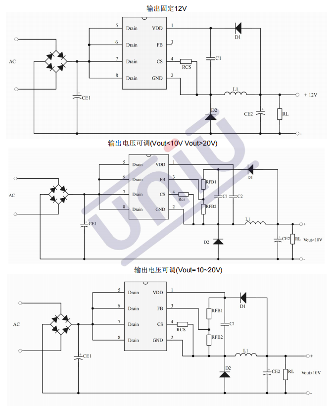 主要特點(diǎn):集成 500V 高壓啟動(dòng)電路;多模式控制、無異音工作;支持降壓和升降壓拓?fù)?默認(rèn) 12V 輸出( FB 腳懸空);待機(jī)功耗低于 50mW;良好的線性調(diào)整率和負(fù)載調(diào)整率;集成軟啟動(dòng)電路;內(nèi)部保護(hù)功能 :過載保護(hù) (OLP);逐周期電流限制 (OCP);輸出過壓保護(hù) (OVP);VDD 過壓、欠壓和電壓箝位保護(hù)